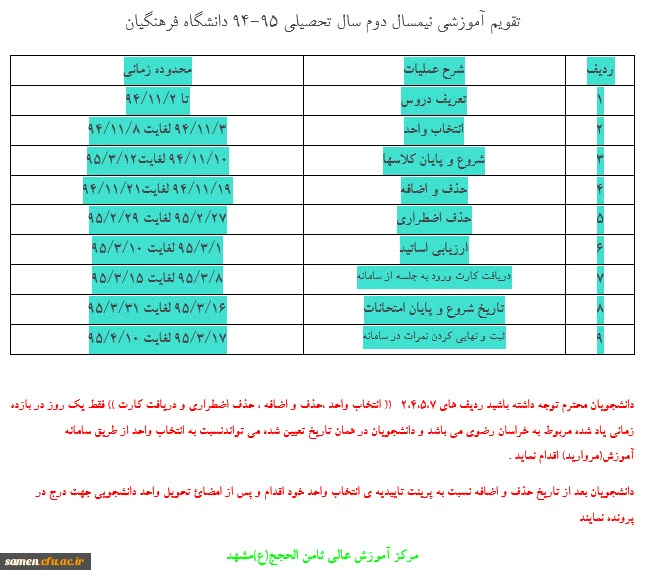 امتیاز دهید : تقویم آموزشی نیمسال دوم سال تحصیلی 95-94 دانشگاه فرهنگیان پنجشنبه 24 دی 1394 ساعت 13:48