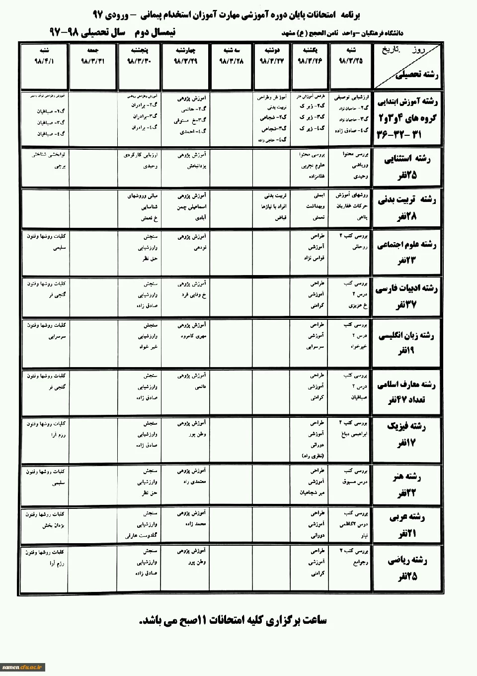 برنامه امتحانات پایان نیمسال دوم سال تحصیلی 97-98