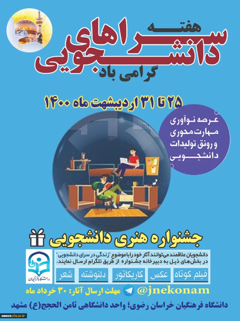 امتیاز دهید : هفته سراهای دانشجویی گرامی باد. 25 تا 31 اردیبهشت ماه 2 دوشنبه 27 اردیبهشت 1400 ساعت 12:34