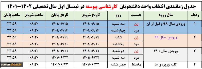 جدول زمانبندی انتخاب واحد دانشجویان پیوسته در نیمسال اول سال تحصیلی 1402-1401 2